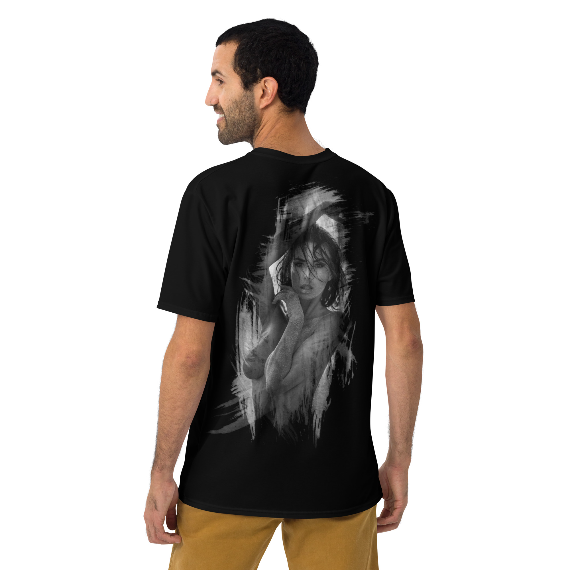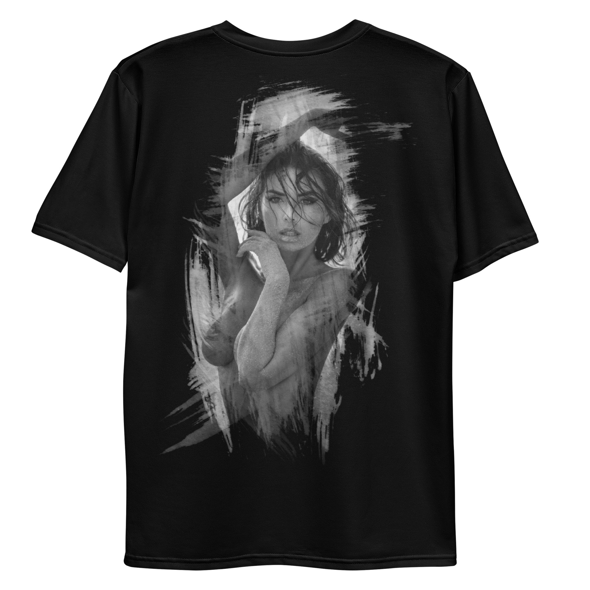 The brushstroke-inspired background merges fashion with photographic art, giving the shirt a distinctive, modern signature.